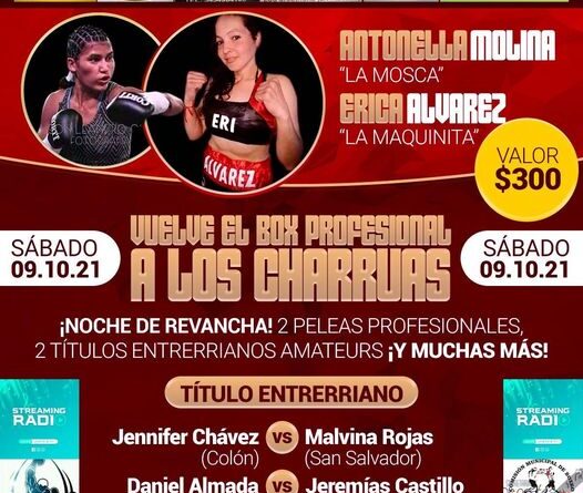 Luego se vienen dos títulos entrerrianos en juego: lo disputarán Jénifer Chaves de Colón y Malvina Rojas de San Salvador, y luego Daniel «Panterita» Almada se las verá con Jeremías «El Eléctrico» Castillo de Gualeguaychú. Y en la estelar la local Erica «La Maquinita» Álvarez, en pelea revancha, con la experimentada Beta Santana de Colón.